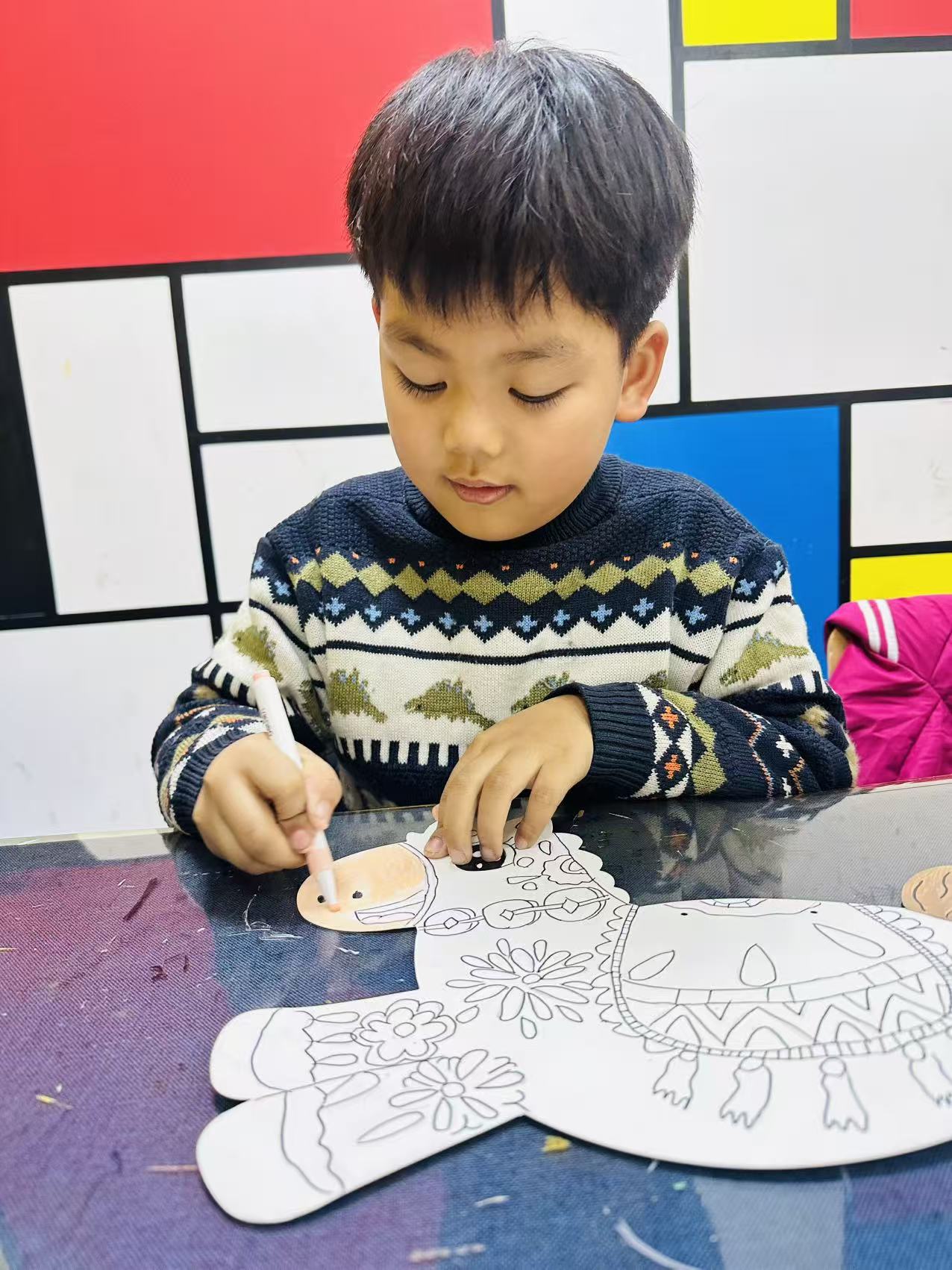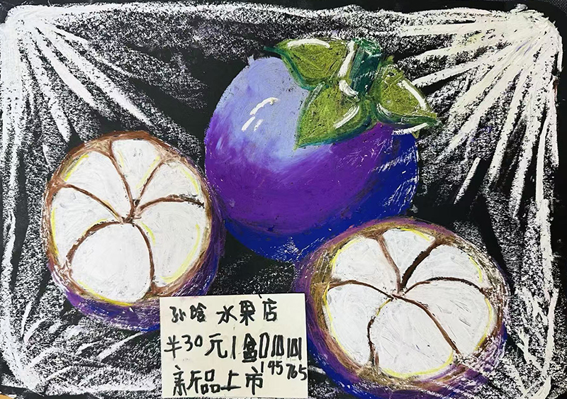 孫鑠:7歲 畫齡:1年 作品名稱:《包裝盒里的水果》 指導(dǎo)老師:黃島官廳教學(xué)基地——李金潼
