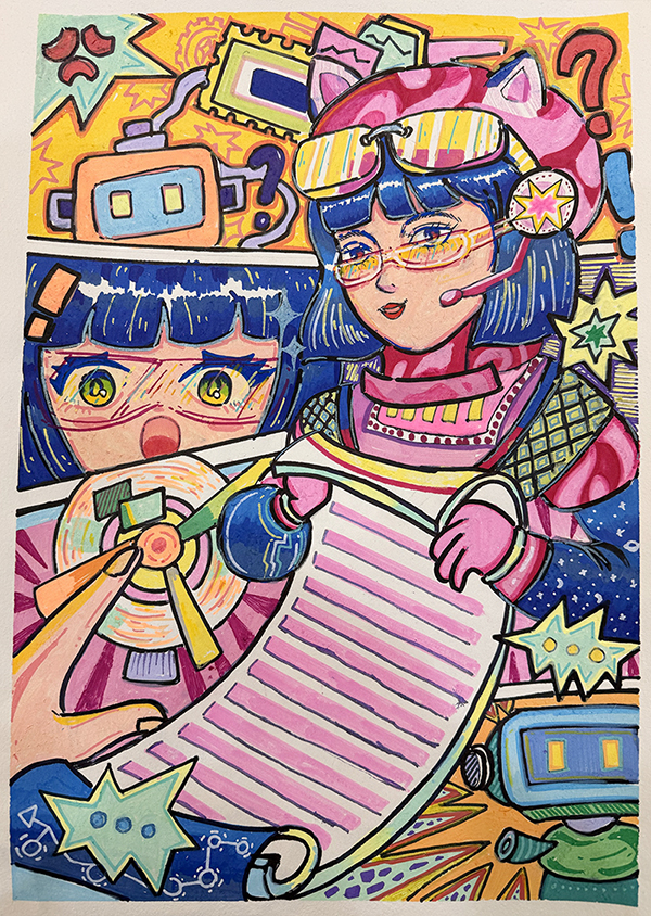 蘇彥希:7歲 畫齡:3年 作品名稱:《神經(jīng)漫游者》 指導(dǎo)老師:前海利群教學(xué)基地——馬梓筠