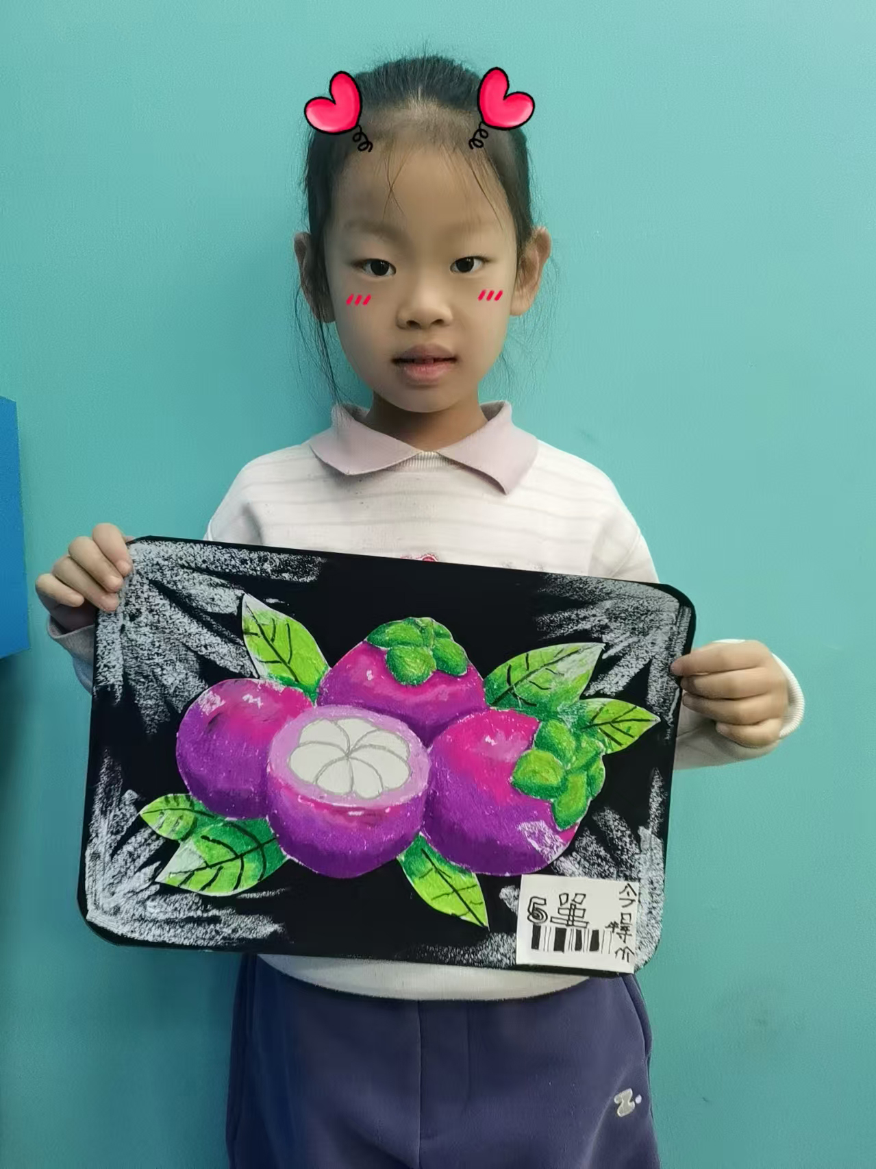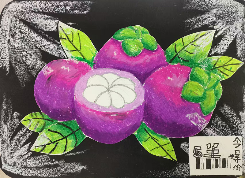 喬芊一:7歲 畫齡:2年 作品名稱:《包裝盒里的水果》 指導(dǎo)老師:黃島官廳教學(xué)基地——龔麗鑒