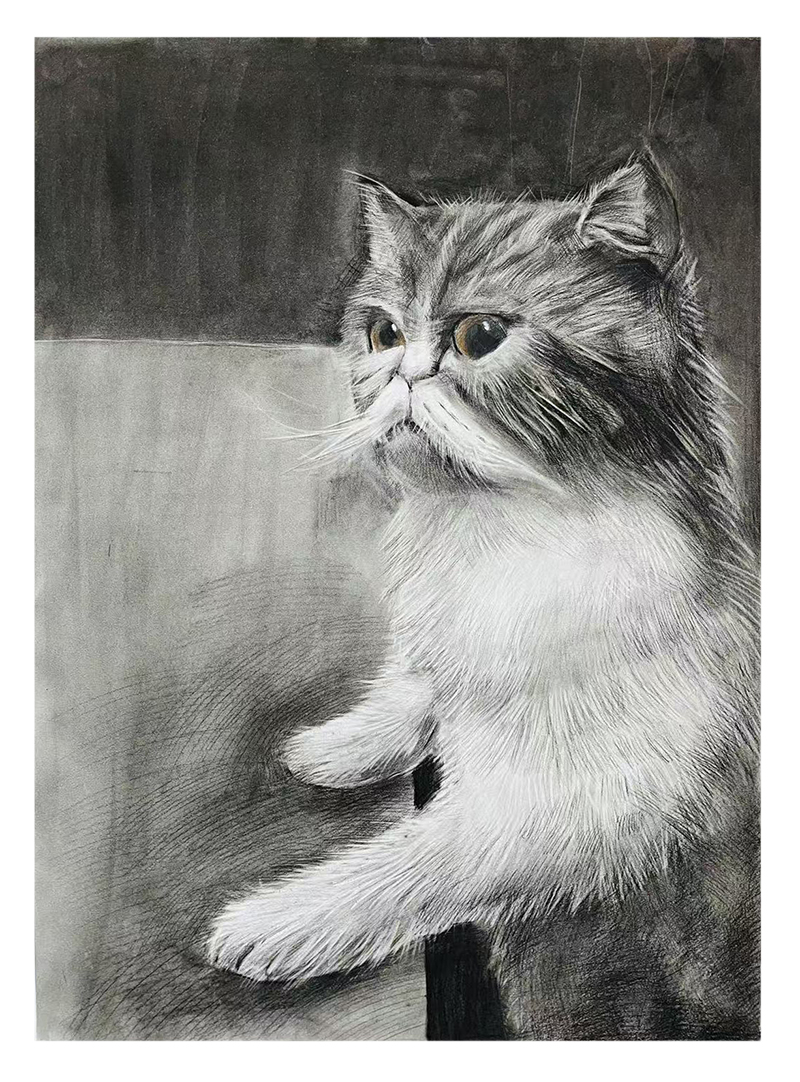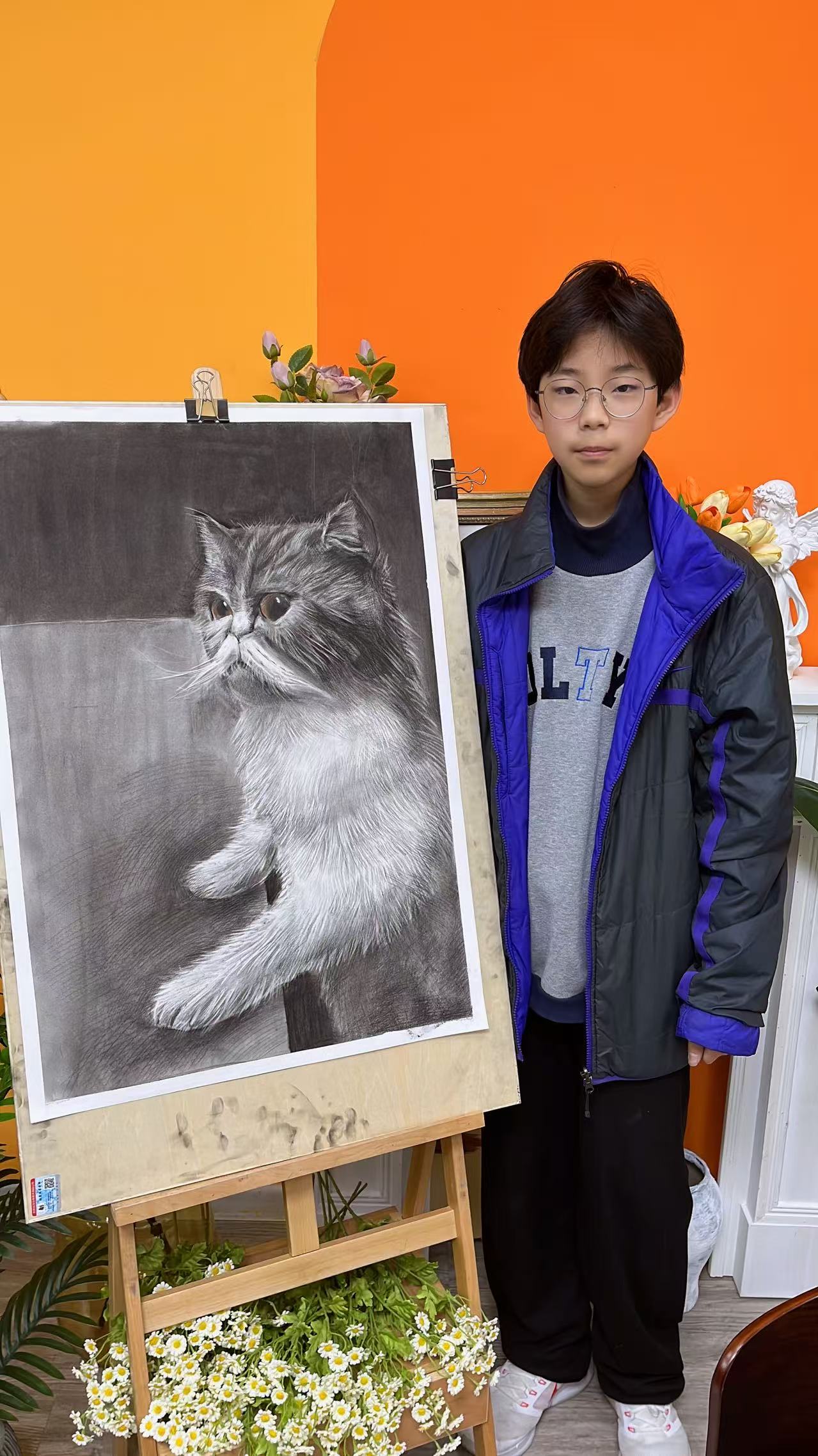 于家棟:14歲 畫齡:5年 作品名稱:《貓咪寫生》 指導(dǎo)老師:李滄順和教學(xué)基地——?jiǎng)⒓?