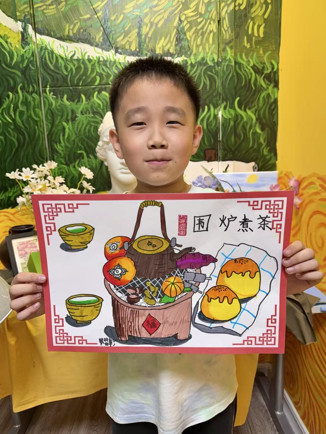 耿習(xí)彰:8歲 畫齡:4年 作品名稱:《圍爐煮茶》 指導(dǎo)老師:黃島官?gòu)d教學(xué)基地——張曉琪