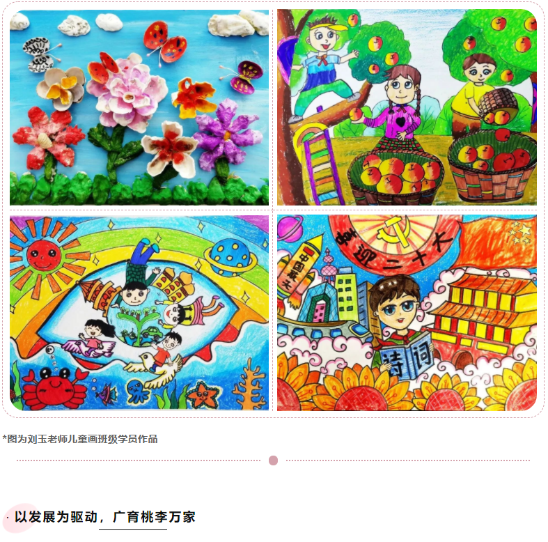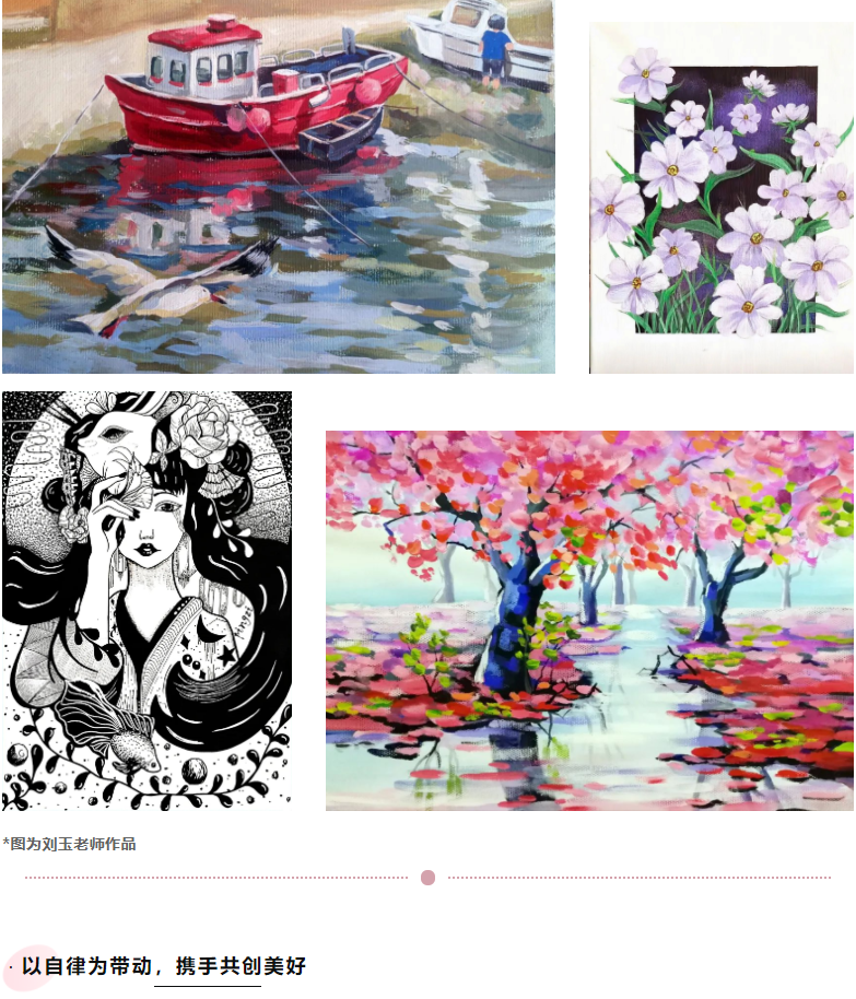 而好的教育絕不是一成不變的,縱使擁有8年的教學經驗,劉玉老師也依舊在實踐中不斷探索?!耙o學生一杯水,老師要有一桶水,而在當今的社會,老師僅有一桶水已經遠遠不夠了,要有一潭水。所以我在工作之余通過閱讀兒童教育相關內容、深入學習新的畫種、瀏覽藝術網站等,來完善自己的知識儲備,提升個人素養(yǎng),以備面對不同學員的需求?!?/span>