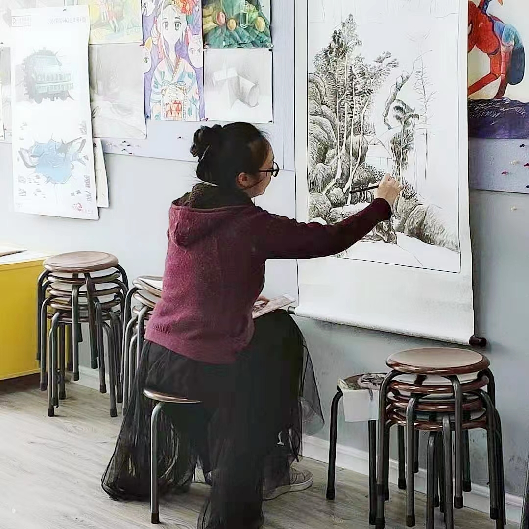 于洋老師在負(fù)責(zé)市南中聯(lián)教學(xué)基地日常素描課程的教學(xué)外還是點(diǎn)金美術(shù)的高級(jí)教研員,參與定期的課程體系升級(jí)工作。因?yàn)楸旧砭褪菍W(xué)習(xí)國(guó)畫(huà)專(zhuān)業(yè)的緣故,在課程設(shè)置的時(shí)候,于洋老師會(huì)在其中融入很多中國(guó)元素,為學(xué)員們不斷拓展知識(shí)面,讓他們可以汲取更多的養(yǎng)分。