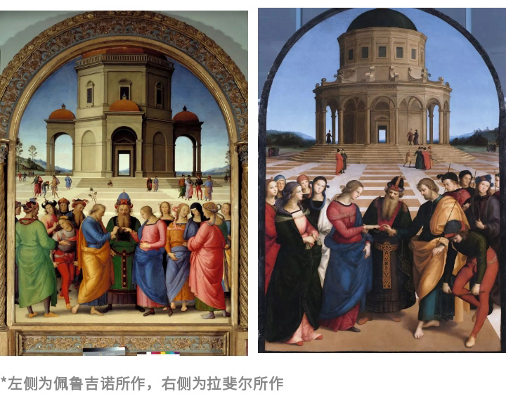 當(dāng)時(shí),佩魯吉諾剛開(kāi)始描繪“圣母的婚禮”主題,少年拉斐爾也投身于這一主題的練習(xí)中。但拉斐爾在畫(huà)面中呈現(xiàn)出更優(yōu)秀的空間感,突出了自己的繪畫(huà)風(fēng)格;而老師描繪的橫向檐壁以及人物的展現(xiàn)方式略顯生硬。