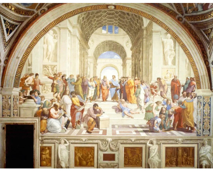 畫(huà)中描繪的,是以古希臘哲家亞里士多德和柏拉圖為中心匯聚著50多位不同時(shí)代、不同學(xué)派的著名學(xué)者,在這里探討著人類的各種學(xué)問(wèn)。