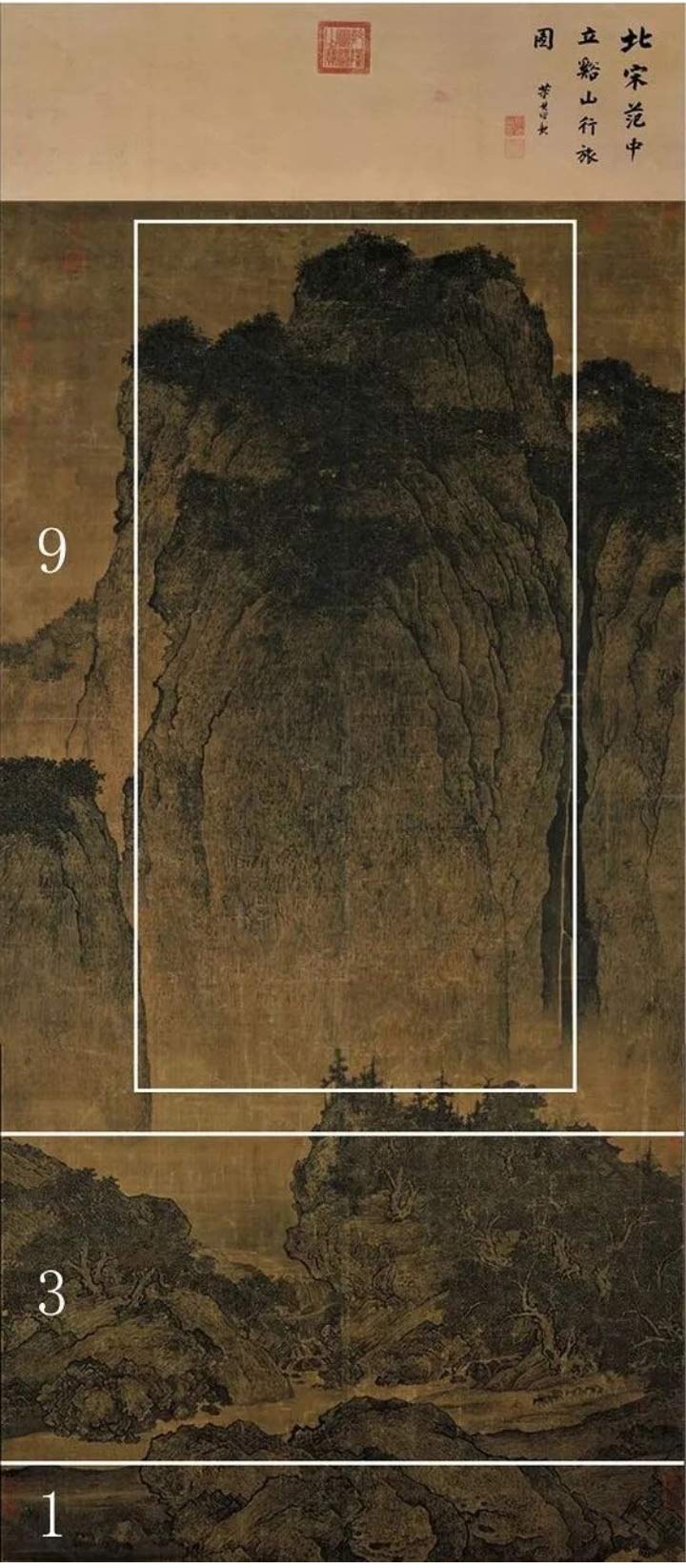 整幅畫險(xiǎn)峻卻均衡,采取近、中、遠(yuǎn)三段式構(gòu)圖,令人咋舌。1:3:9的比例關(guān)系,高聳的山峰占據(jù)了畫面的近2/3,給人以頂天立地,高山仰止的感受。