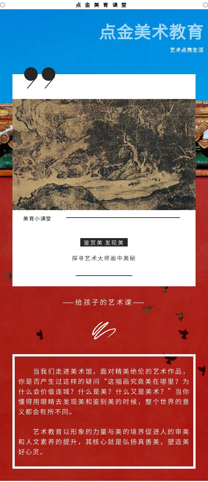 在【點(diǎn)金美術(shù)官方服務(wù)號(hào)】的日常更新中,加入名畫的作品介紹和欣賞的內(nèi)容,貼合校內(nèi)美育教育,以此全面發(fā)展學(xué)生的美術(shù)核心素養(yǎng)。
