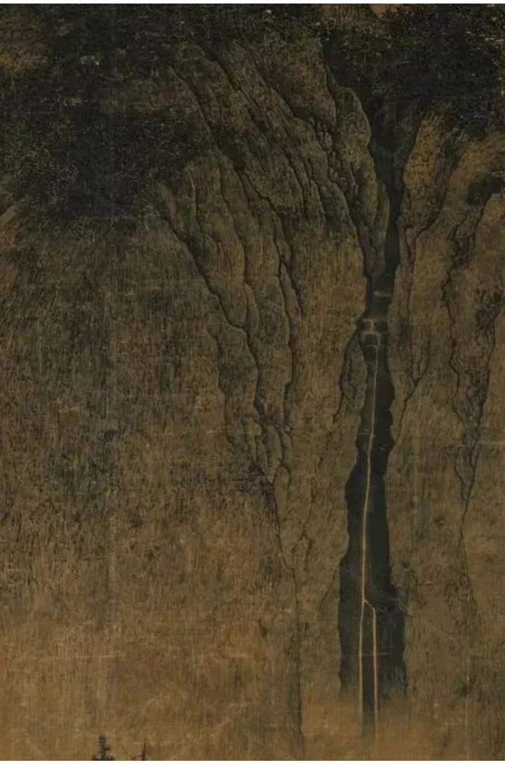 為了打破沉悶的山體,范寬對(duì)山間的瀑布也做了設(shè)計(jì),在幽深的山林間設(shè)計(jì)了“一線天”瀑布,加深了畫面層次。