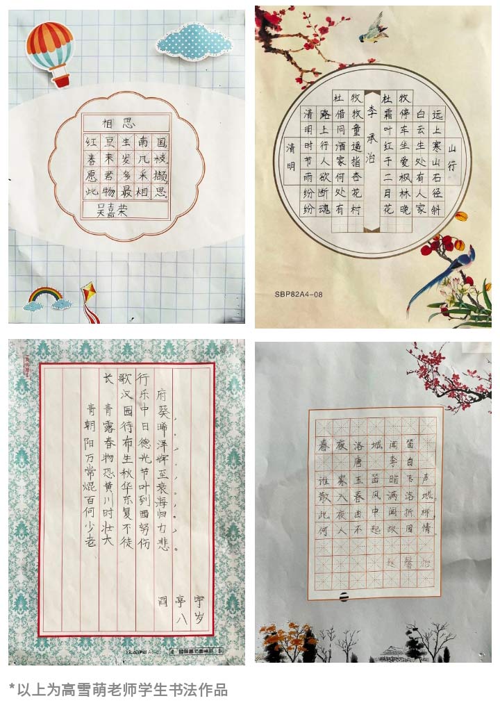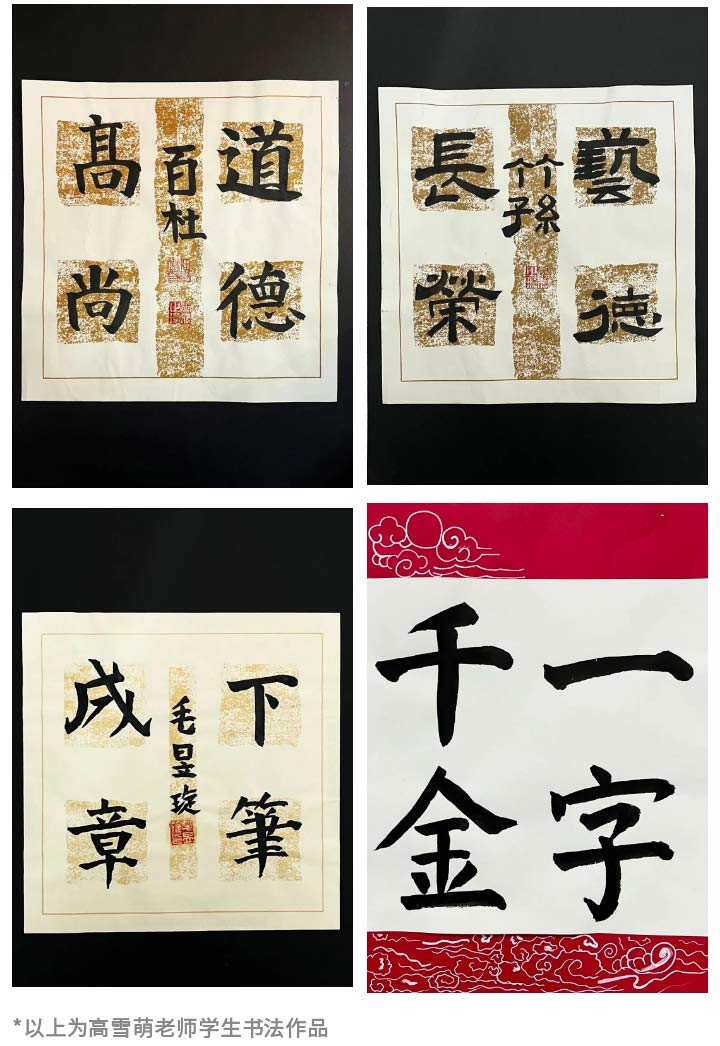 自幼學(xué)習(xí)書法的高雪萌老師自然是書法學(xué)習(xí)的受益者?!皶▽W(xué)習(xí)有利于學(xué)生的多種能力的培養(yǎng),首先通過對(duì)書法碑帖的臨習(xí)首要鍛煉的就是觀察力。古人說:‘察之者尚精,擬之者貴似?!瘜W(xué)生通過觀察每個(gè)字的點(diǎn)畫結(jié)構(gòu)、用筆方法和特征,從而心摹手追,提升觀察事物的能力。另外,學(xué)習(xí)書法,對(duì)一個(gè)人的專注力、耐力的培養(yǎng)也有著作用。再者,如果能夠引導(dǎo)孩子在中國傳統(tǒng)藝術(shù)投入足夠的學(xué)習(xí)和關(guān)注,這也是為弘揚(yáng)中華文化做出了綿薄的貢獻(xiàn)?!?/span>