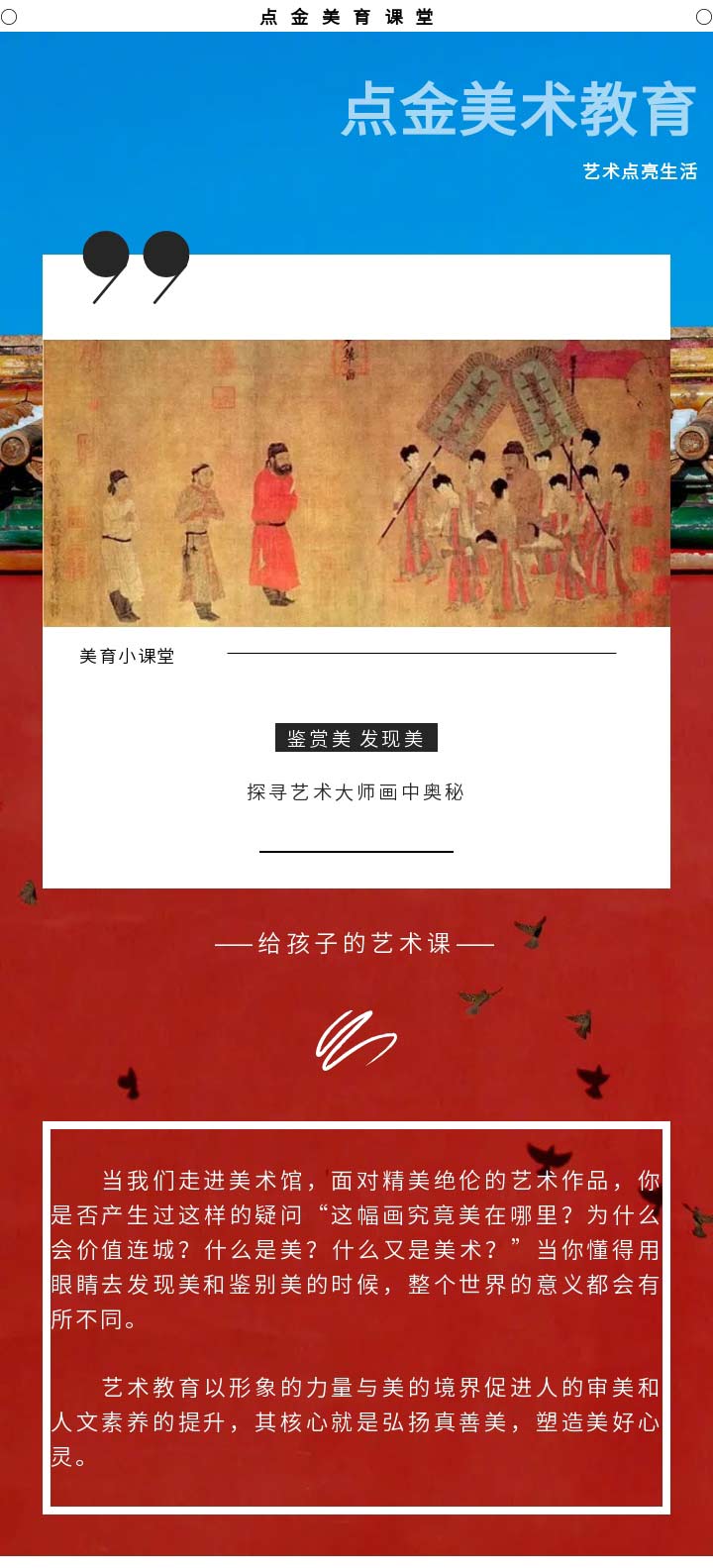 在【點金美術官方服務號】的日常更新中,加入名畫的作品介紹和欣賞的內容,貼合校內美育教育,以此全面發(fā)展學生的美術核心素養(yǎng)。