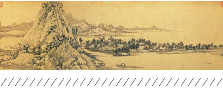 《富春山居圖》所采用的是一種橫卷的方式,按照人的正常視野,構(gòu)造了同一水平上的山水景色,是一種從平面上不斷進行延伸的構(gòu)圖方式。在畫面上,畫家進行了山水的層次感設(shè)計,山的前后是一種由近到遠的排列,在構(gòu)圖方式上給予了前后景物的一種有效聯(lián)系。