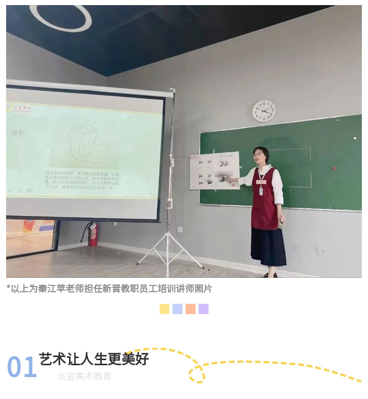 隨著時(shí)代的發(fā)展,點(diǎn)金美術(shù)作為一個(gè)學(xué)習(xí)型企業(yè),時(shí)刻保持空杯心態(tài),通過不斷的學(xué)習(xí),做到所更新的課程可以滿足時(shí)代發(fā)展以及學(xué)員自身藝術(shù)發(fā)展需求。除了一次次的集體培訓(xùn),秦江蘋老師也會(huì)通過這樣的方式不斷完善自己?!笆紫?,我會(huì)參加各種藝術(shù)展覽和專業(yè)講座,了解最新的藝術(shù)動(dòng)態(tài)和教育理念。其次,閱讀相關(guān)的藝術(shù)書籍和教學(xué)理論,提高自己的理論水平和專業(yè)知識(shí)。一定要積極參加內(nèi)部的教研活動(dòng),交流探討,才會(huì)有更多的思路。”她說道。