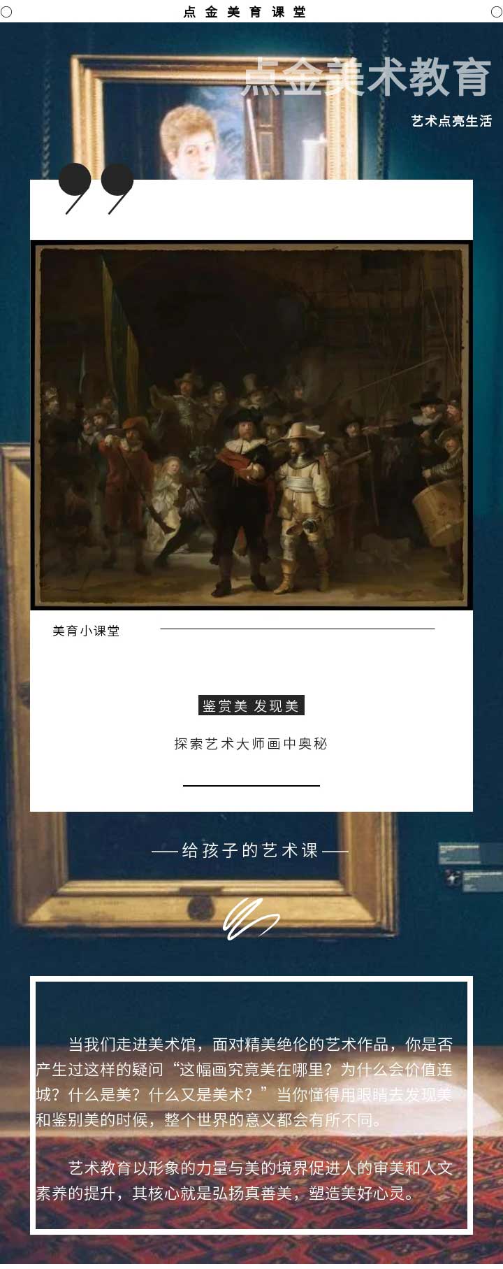 在【點(diǎn)金美術(shù)官方服務(wù)號(hào)】的日常更新中,加入名畫的作品介紹和欣賞的內(nèi)容,貼合校內(nèi)美育教育,以此全面發(fā)展學(xué)生的美術(shù)核心素養(yǎng)。