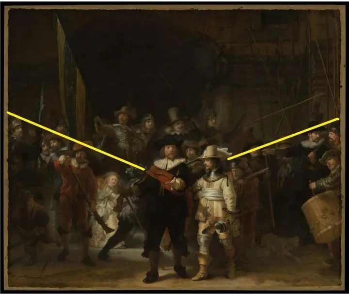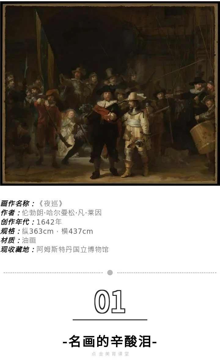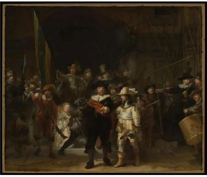 這一期,讓我們欣賞17世紀(jì)40年代畫家倫勃朗·哈爾曼松·凡·萊因創(chuàng)作的一幅油畫,《夜巡》,明暗對(duì)比強(qiáng)烈,層次豐富,富有戲劇性。