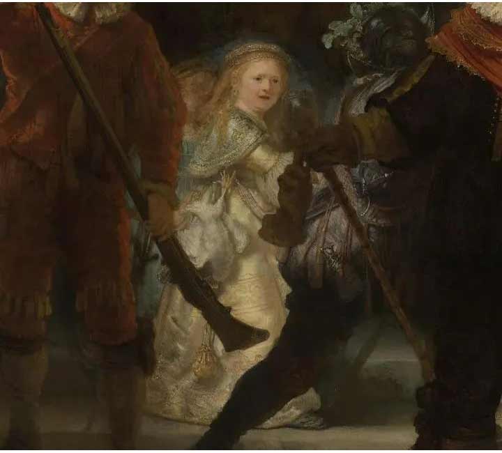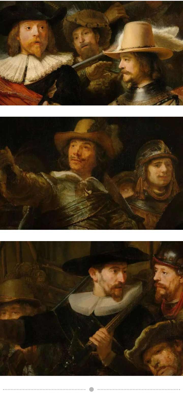 畫中的光線處理像人物一樣復(fù)雜多樣。誰知這幅畫完成后訂件人拒絕接收,因?yàn)槊總€(gè)人的形象或清晰程度不同,或相貌描繪不全,或大小比例不等。