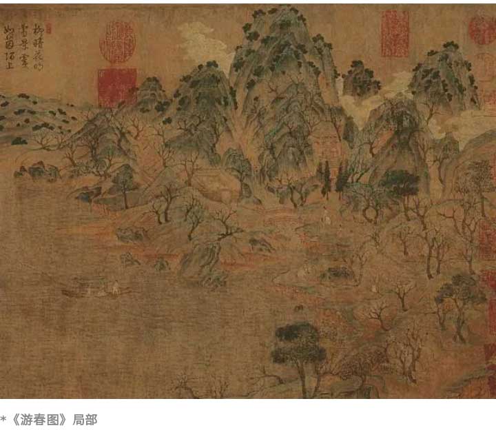 《游春圖》以全景方式描繪了廣闊的山水場(chǎng)景,圖中除描繪了山水樹石外,還描繪了白云出岫,雜以樓閣、院落、橋梁、舟楫,并點(diǎn)綴著踏春賞玩的人物車馬,展示出一幅杏桃綻開、綠草如茵、水波粼粼,春風(fēng)蕩漾的春日融融之景象。