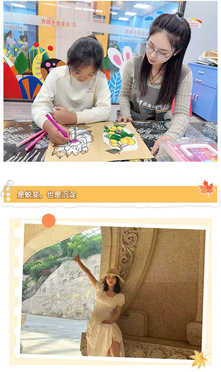 “點金美術(shù)是我畢業(yè)后的第一站,也是我美育夢想生根發(fā)芽的地方?!闭劶八哪瓿砷L歷程,陳清瀅老師的眼中滿是珍視。初入職場時,她是專注于“把課講透、讓孩子愛上畫畫”的一線教員,讓每一個孩子都能在畫筆間找到快樂。