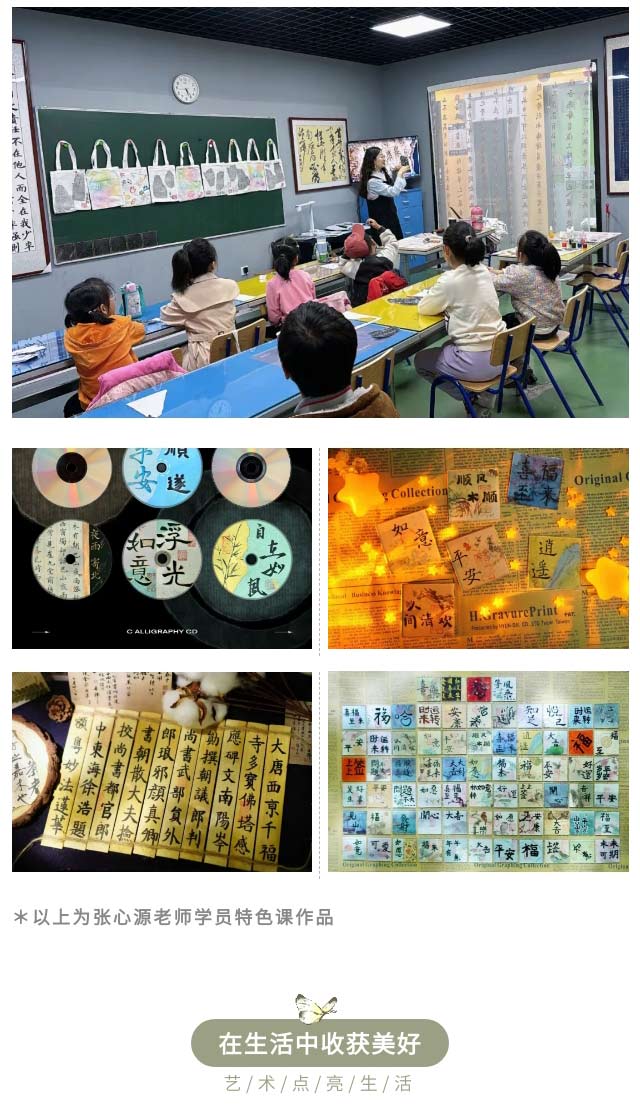 “結(jié)合傳統(tǒng)節(jié)日、寒暑假等特殊的時(shí)間節(jié)點(diǎn),用現(xiàn)代的表現(xiàn)形式給孩子們?cè)O(shè)計(jì)一些文化與趣味相結(jié)合的特色課程,書(shū)法光盤(pán)、藝術(shù)字冰箱貼、甲骨文拓印帆布包等……讓孩子們明白,書(shū)法不是機(jī)械重復(fù)的寫(xiě)字,而是傳統(tǒng)與現(xiàn)代、文化與藝術(shù)的結(jié)合體。”