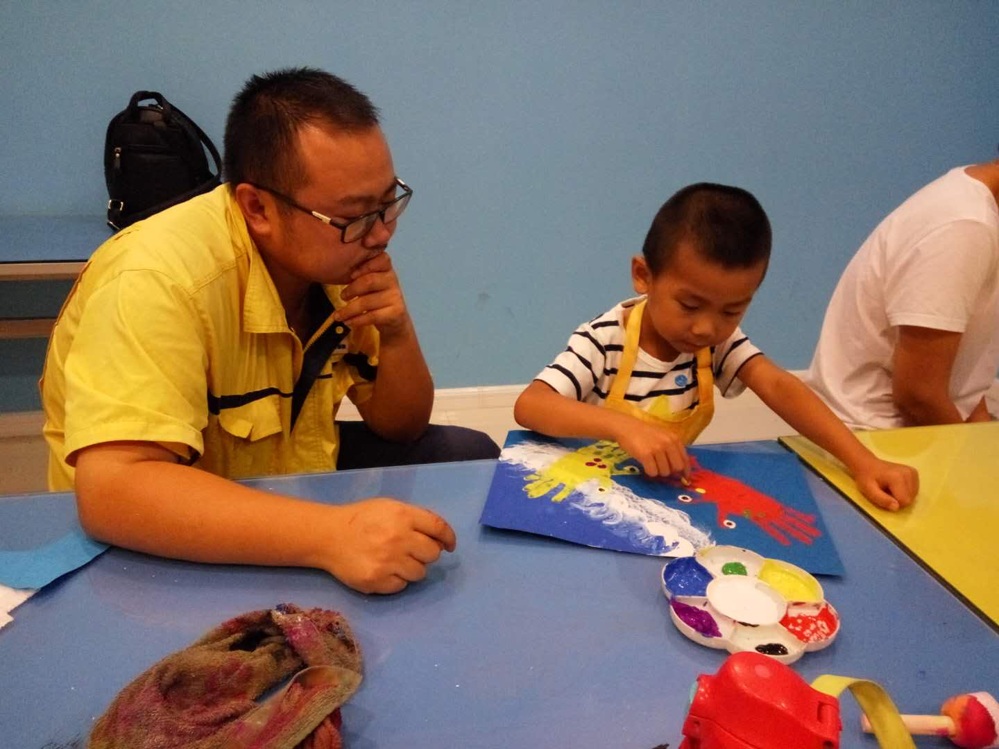 親子課程剛開始,孩子和家長們一起首先用水粉顏料畫出了大海的形狀并運用了粘棒畫出了浪花,接下來根據(jù)任課老師的引導(dǎo),將自己的手掌變?yōu)楫嫻P,并以手型為基礎(chǔ),選擇喜歡的水粉顏色,共同畫出了可愛的小螃蟹,最后用油畫棒裝飾了背景。