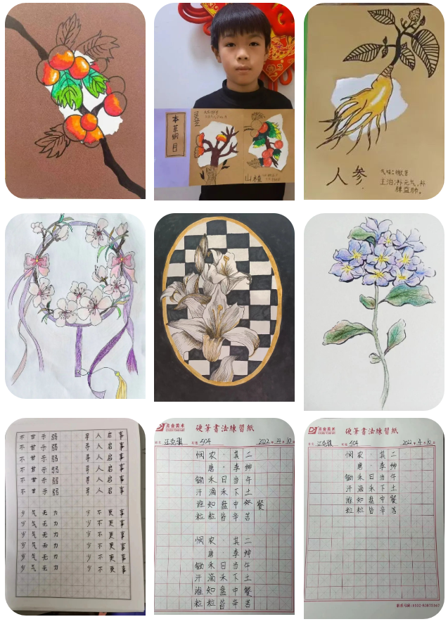 繪畫空間站的小學(xué)員運(yùn)用拼貼折疊的手法呈現(xiàn)了別樣的植物并簡(jiǎn)單了解了醫(yī)學(xué)著作《本草綱目》;專業(yè)繪畫班的學(xué)員用簡(jiǎn)單的線條和嫻熟的繪畫技巧勾畫出一幅幅植物復(fù)古裝飾畫;書法班的小學(xué)員從成語和古詩中品味著優(yōu)秀的中華傳統(tǒng)文化。