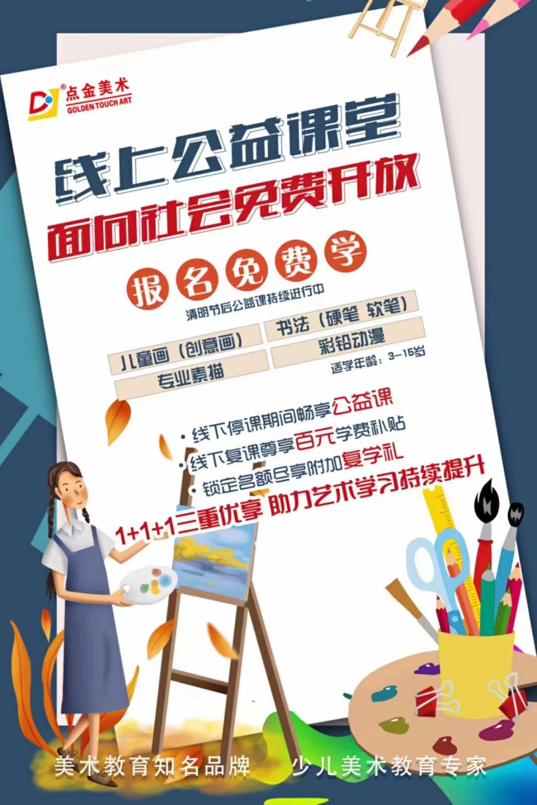 隨著點(diǎn)金美術(shù)線下課程開啟的日子越來越近,老師和小學(xué)員們都非常期待。而點(diǎn)金美術(shù)也為現(xiàn)在正在進(jìn)行免費(fèi)公益課學(xué)習(xí)的非點(diǎn)金學(xué)員獻(xiàn)上線下停課期間公益課、線下復(fù)課尊享百元學(xué)費(fèi)補(bǔ)貼、現(xiàn)在聯(lián)系校區(qū)任課老師鎖定名額盡享附加復(fù)課禮的大禮,1+1+1三重優(yōu)享助力藝術(shù)學(xué)習(xí)持續(xù)提升。