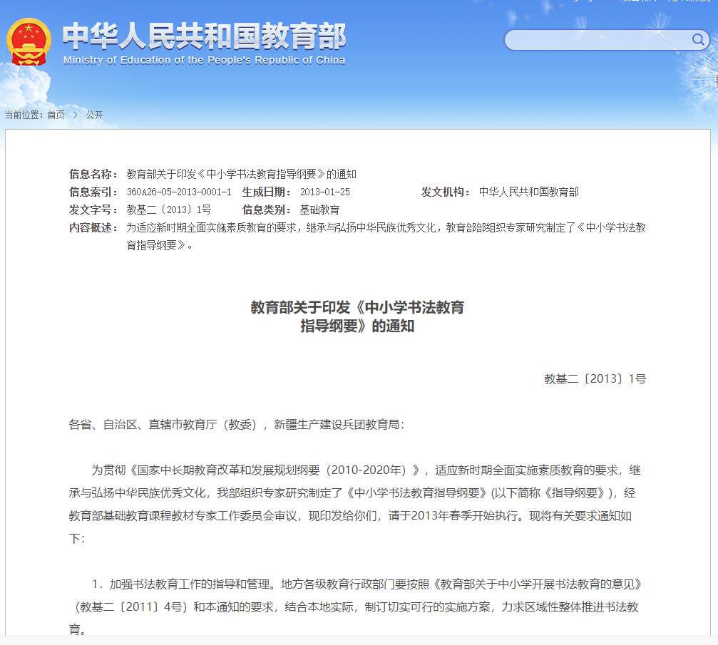 書法教育屬于美育教育,是素質(zhì)教育的重要內(nèi)容之一,早在2013年起為適應(yīng)新時(shí)期全面實(shí)施素質(zhì)教育的要求,繼承與弘揚(yáng)中華民族優(yōu)秀文化,教育部部組織專家研究制定了《中小學(xué)書法教育指導(dǎo)綱要》。