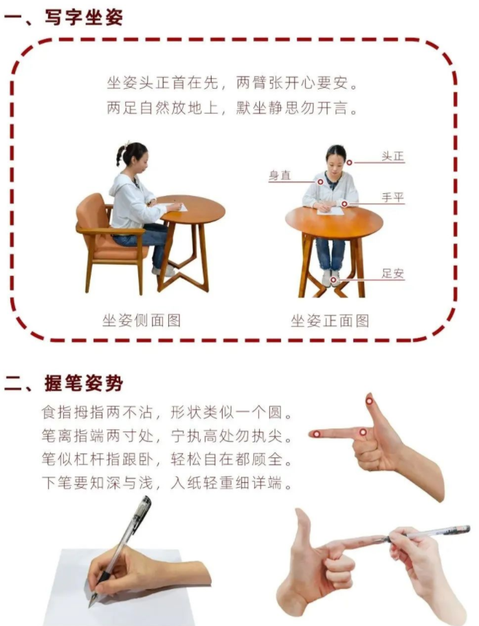 從寫字的坐姿和握筆姿勢(shì)開始,正確的寫字姿勢(shì)不僅能保證書寫自如,減輕疲勞、提高書寫水平,而且還能促進(jìn)少年兒童身體的正常發(fā)育、預(yù)防近視、斜視、脊椎彎曲等多種疾病的發(fā)生。