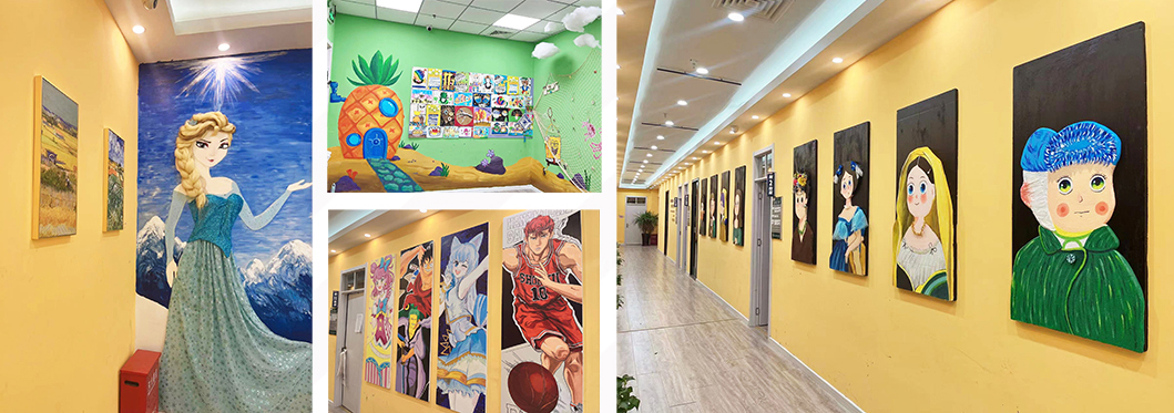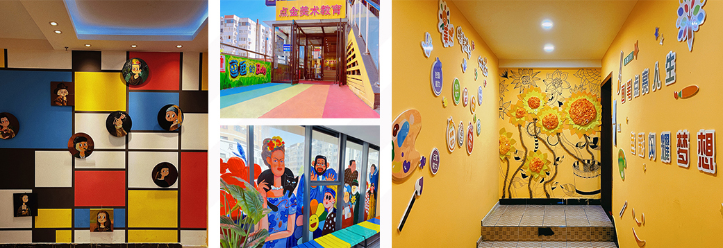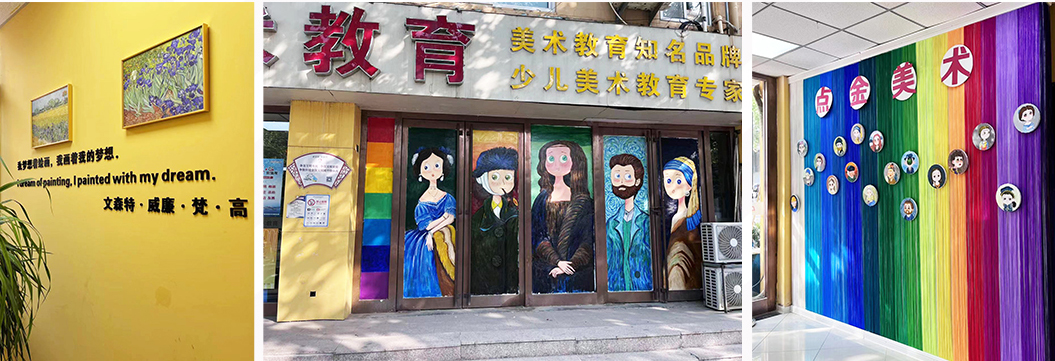 環(huán)創(chuàng),作為學員們走進教學基地第一印象,對學員的有著啟發(fā)、教育的作用,點金美術定期對各校區(qū)進行環(huán)創(chuàng)的更新,給學員們不同的藝術感官體驗,在這種良好的氛圍中激發(fā)學員們的創(chuàng)作欲,并提高他們的審美能力,用環(huán)境育人。