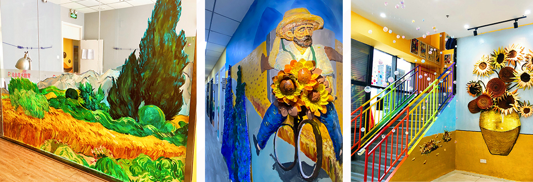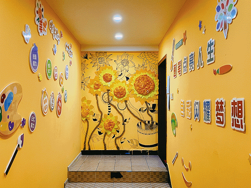 環(huán)創(chuàng)設計充分結合了校區(qū)自身特點,大幅度改善現有教學環(huán)境的空間不足,環(huán)創(chuàng)區(qū)域結構設計合理、巧妙,同時運用不同元素和色彩的疊加,增強空間感,另陳舊的教學環(huán)境煥然一新,立體墻繪的設計豐富了視覺效果,融入不同材料以及立體造型,與學員產生互動感,體現了校區(qū)環(huán)境的藝術教育性。