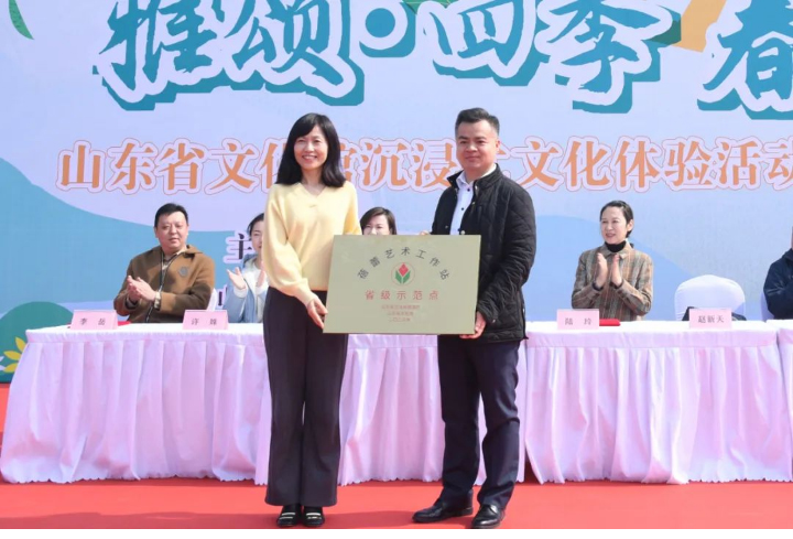 3月19日上午,在由山東省文化館、山東省群眾文化學(xué)會(huì)主辦,青島市文化館、青島點(diǎn)金美術(shù)研究院、青島國信匯泉灣管理有限公司聯(lián)合承辦的“雅頌·四季”沉浸式文化體驗(yàn)活動(dòng)之“春天來了”千名娃娃繪長卷活動(dòng)現(xiàn)場,青島點(diǎn)金美術(shù)研究院獲評(píng)“蓓蕾藝術(shù)工作站省級(jí)示范點(diǎn)”,山東省文化館館長趙新天向點(diǎn)金美術(shù)研究院校長侯魯峰隆重授予“蓓蕾藝術(shù)工作站省級(jí)示范點(diǎn)”牌匾。