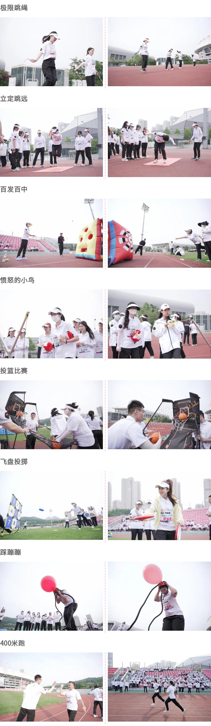 精彩的個(gè)人項(xiàng)目:極限跳繩、立定跳遠(yuǎn)、百發(fā)百中、憤怒的小鳥、投籃比賽、飛盤投擲、踩蹦蹦、400米跑等,各校區(qū)報(bào)名參賽的老師們發(fā)揮出自己的特長,在賽場上展示著他們的風(fēng)采,伴隨著同伴的歡呼聲,成為了國信運(yùn)動(dòng)場上一道靚麗的風(fēng)景線。