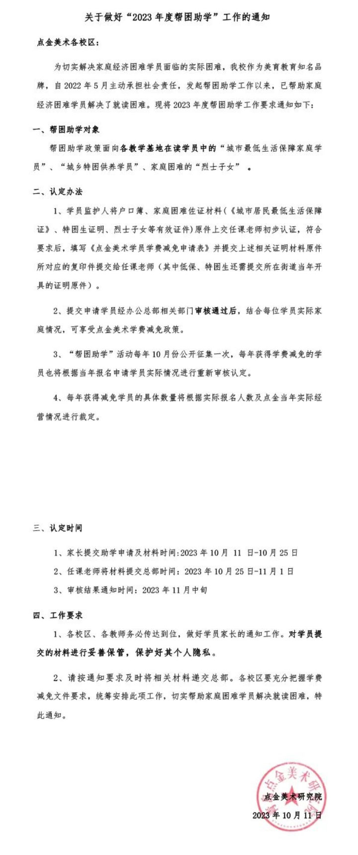 通知公告丨點金美術(shù)關于啟動“2023年度幫困助學”工作的通知