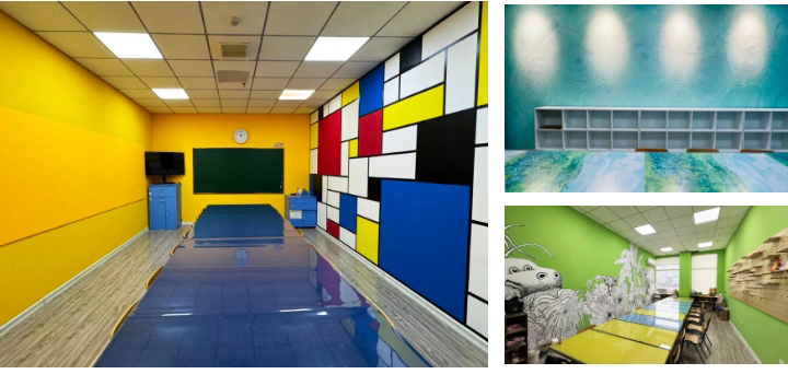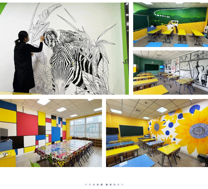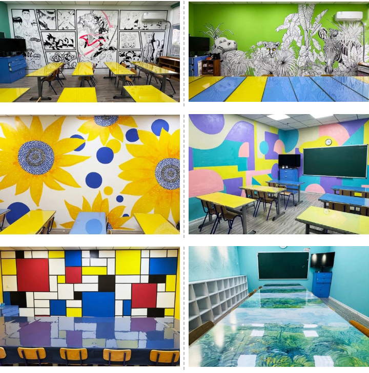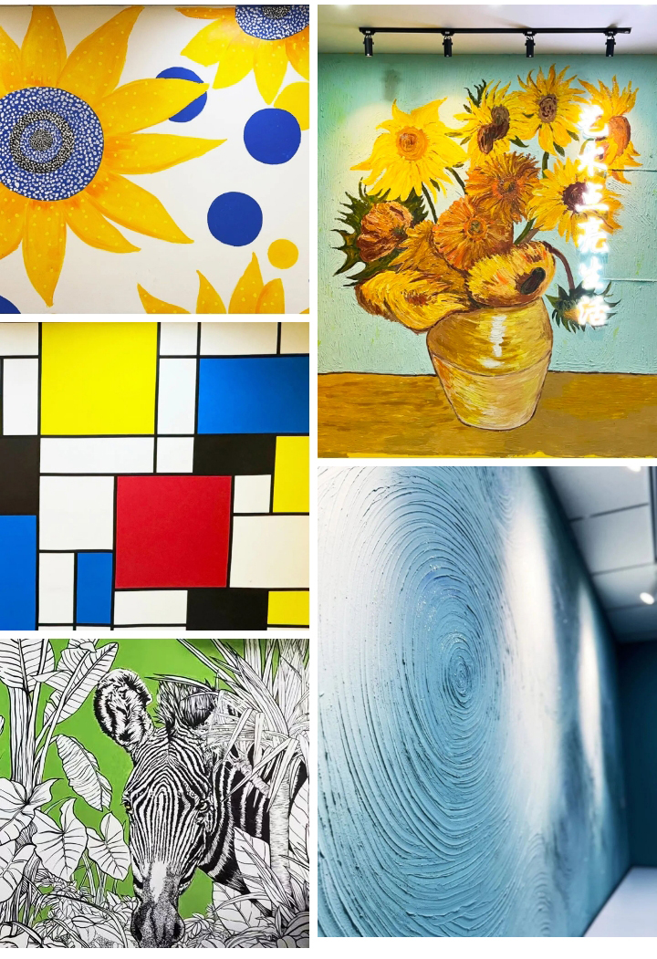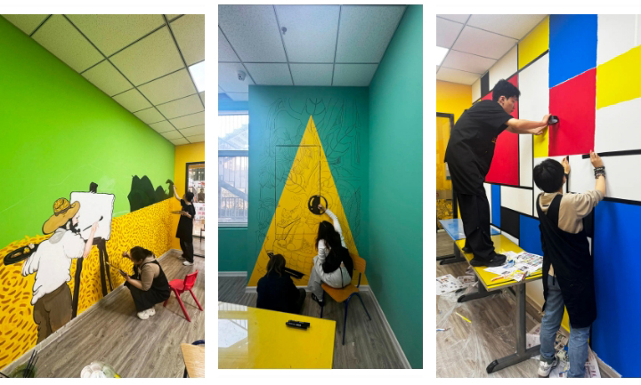 在教室設(shè)計方面,根據(jù)不同年齡段和課程類型,采取了差異化的布置。蒙德里安、梵高等大師作品元素的運用,孩子們喜歡的哪吒、灌籃高手、瘋狂動物城等動漫人物形象,石英砂肌理造型墻將墻體變得更富立體感,校區(qū)老師們無不用生動的畫面和絢麗的色彩激發(fā)學(xué)員們的藝術(shù)靈感。