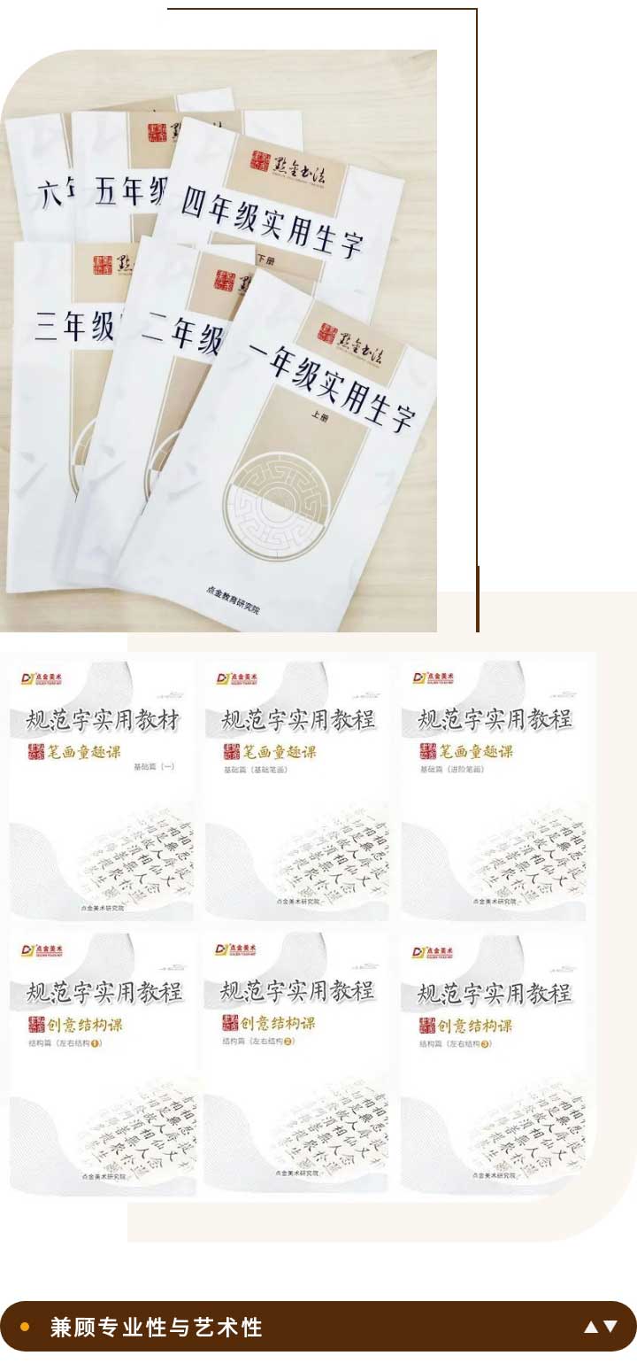 點(diǎn)金書(shū)法課程集結(jié)了書(shū)法教研團(tuán)隊(duì)的智慧,從字源、字形、字意出發(fā),結(jié)合語(yǔ)文課本中的生字、詞組、古詩(shī),探究字體結(jié)構(gòu)中蘊(yùn)藏的規(guī)律,并集結(jié)成教材,硬筆、軟筆區(qū)分教學(xué),生動(dòng)富有趣味。