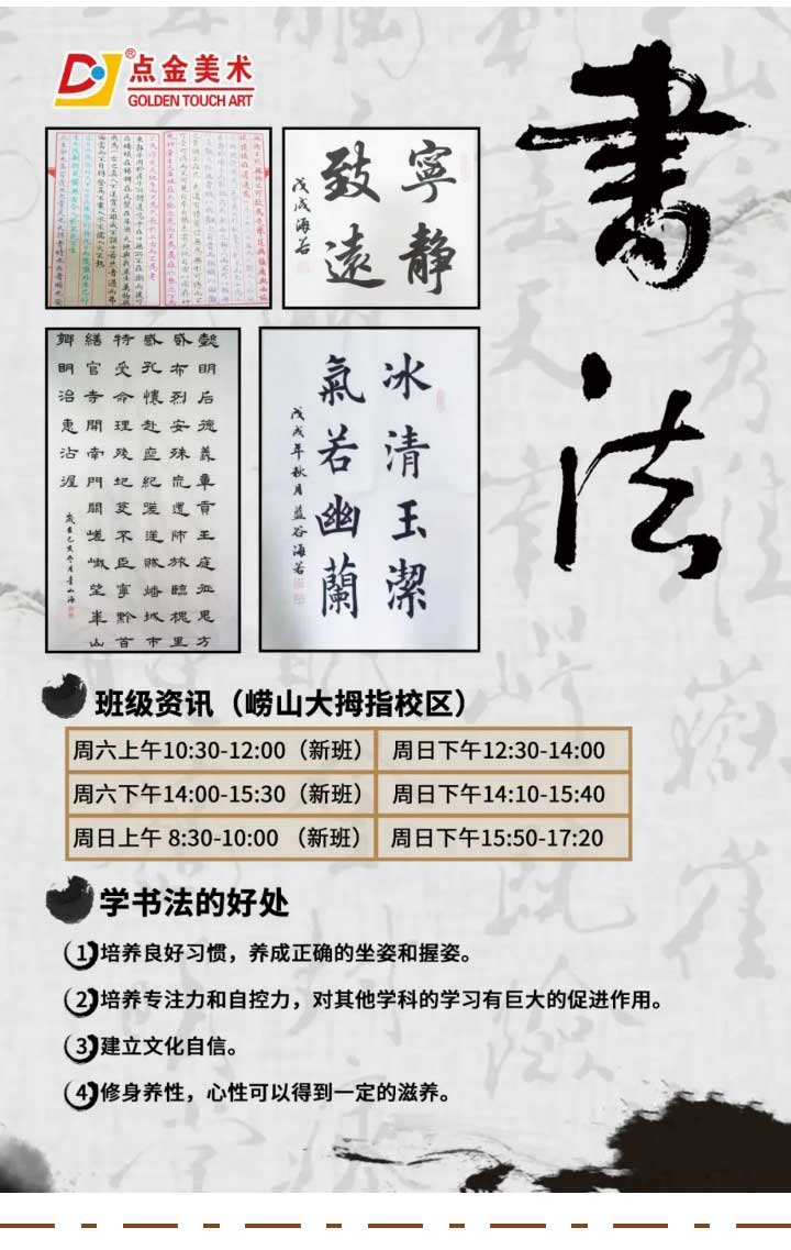 點(diǎn)金助力孩子們?cè)跁?shū)法學(xué)習(xí)的路上越走越遠(yuǎn),讓孩子們?cè)邳c(diǎn)金體會(huì)到文字的魅力,感受文字的文化底蘊(yùn)。歡迎熱愛(ài)書(shū)法的嶗山大拇指校區(qū)老學(xué)員到校領(lǐng)取書(shū)法禮品,同時(shí)也期待更多熱愛(ài)藝術(shù)的孩子們加入點(diǎn)金美術(shù)這個(gè)大家庭。