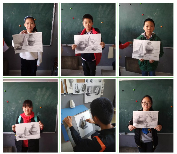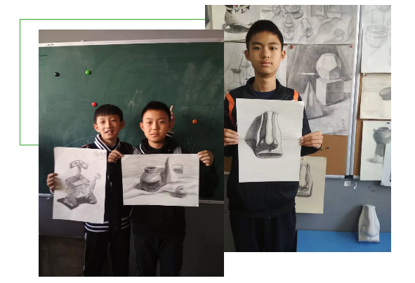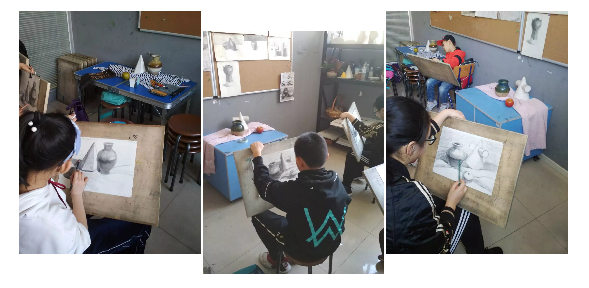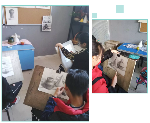 課堂上,孩子們通過(guò)任課老師講解,學(xué)習(xí)自主觀察靜物的位置比例關(guān)系,結(jié)構(gòu)造型特點(diǎn),根據(jù)各自不同的角度分析透視尋找光影,學(xué)著用自己的眼睛去找畫(huà)面關(guān)系,用自己的大腦去思考處理畫(huà)面,一堂寫(xiě)生素描課既鍛煉了學(xué)生的觀察能力,造型能力,分析思考能力又培養(yǎng)了同學(xué)們善于發(fā)現(xiàn),勤于動(dòng)腦的好習(xí)慣。