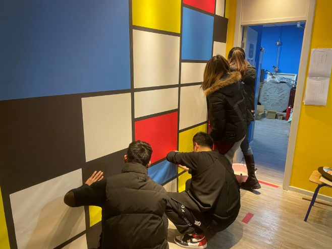 在此次環(huán)創(chuàng)設(shè)計(jì)中,臺東校區(qū)的老師們將原有的勇攀高峰主題墻換成了蒙德里安風(fēng)格的格子畫,蒙德里安是幾何抽象畫派的先驅(qū),對后世的建筑、設(shè)計(jì)等影響很大。