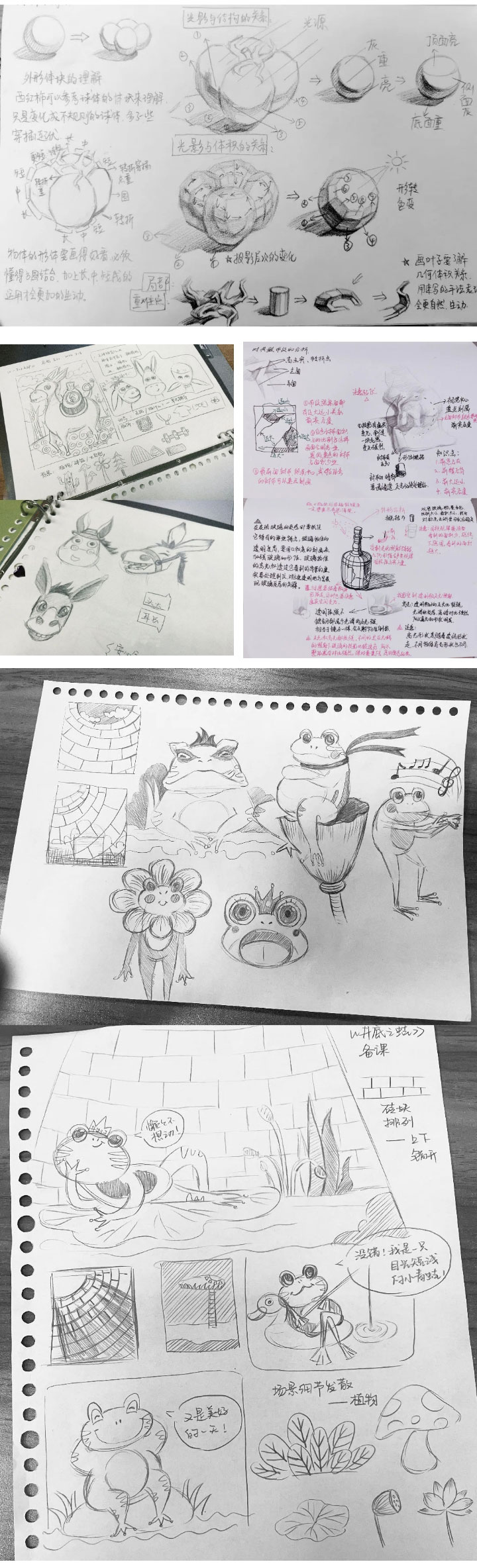 針對(duì)不同課程,備課小稿的設(shè)計(jì)也是不同的。兒童畫(huà)備課手稿充滿想象力,與課程主題的相關(guān)素材會(huì)提前備好;素描備課手稿會(huì)將構(gòu)圖、光影、明暗關(guān)系等知識(shí)進(jìn)行列舉;書(shū)法備課手稿老師都會(huì)將字形、結(jié)構(gòu)等需要加強(qiáng)的地方標(biāo)注出來(lái),使學(xué)員們掌握的更加牢固。