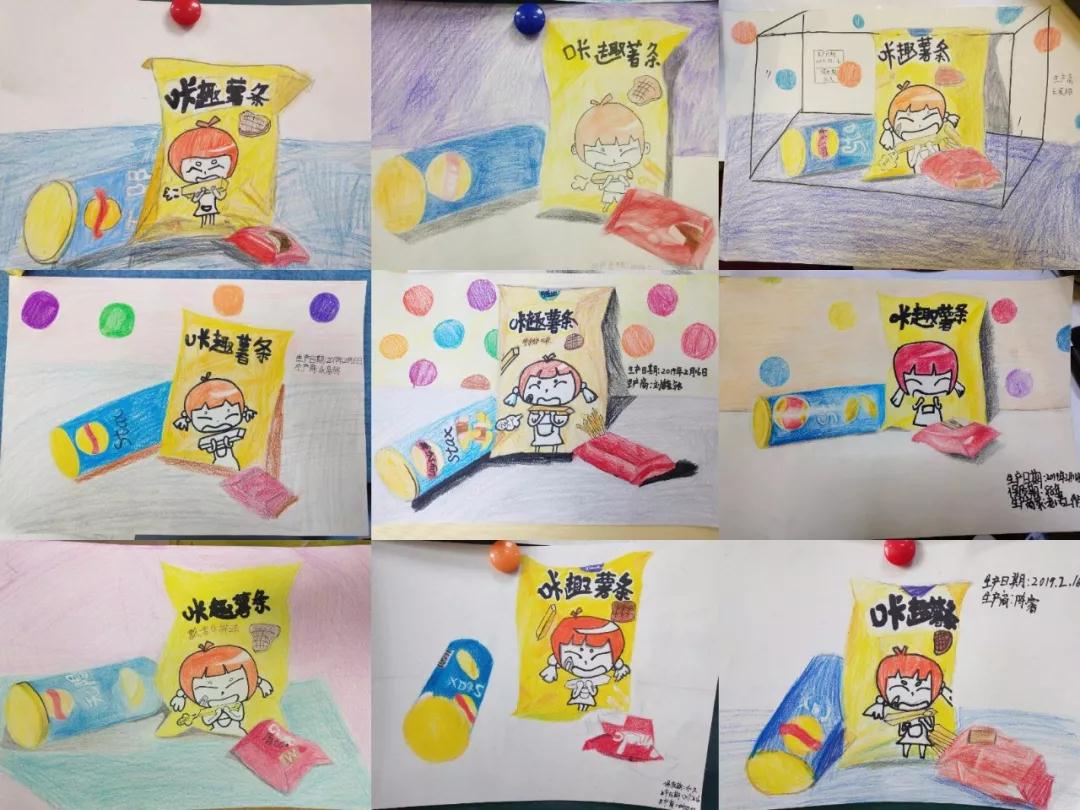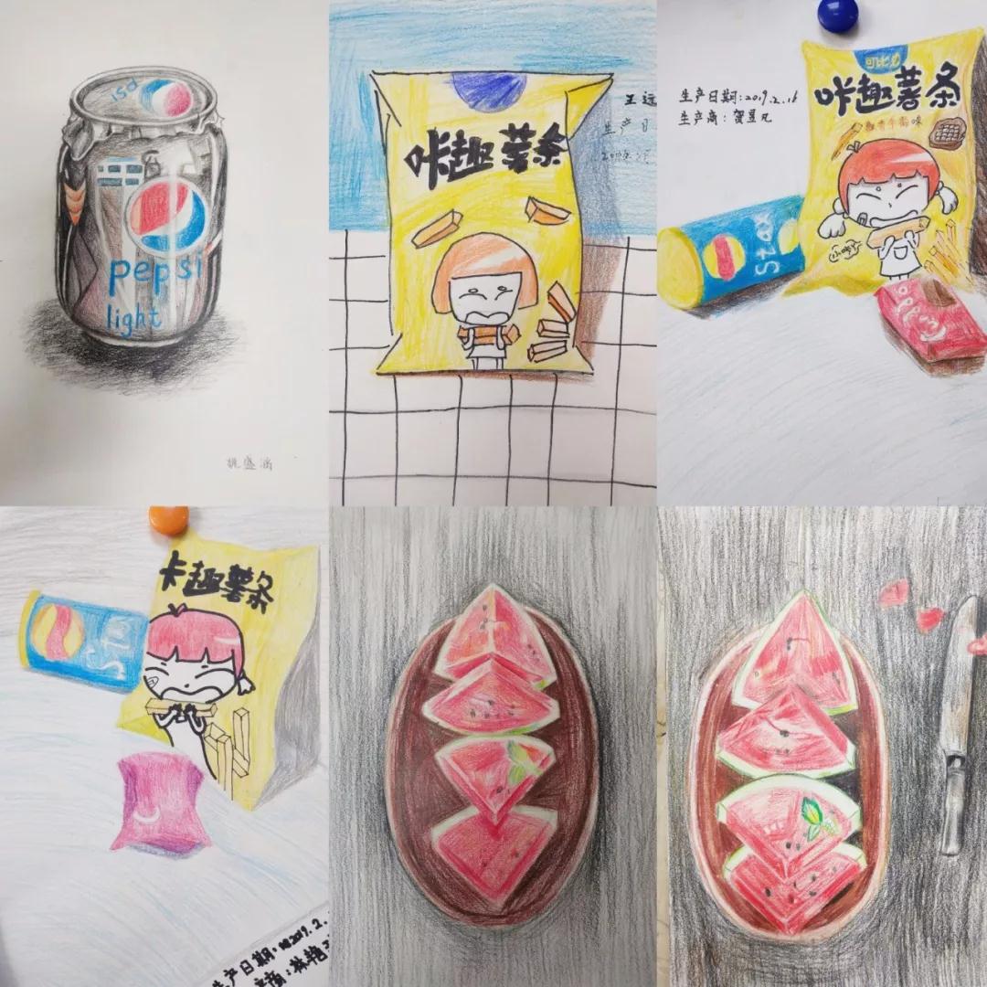 課堂上,孩子們通過對食品外包裝的觀察,提取外輪廓造型,并且把包裝上復雜的圖案等內(nèi)容細節(jié)刻畫出來,找出零食在光源下的顏色變化,環(huán)境色對零食固有色的影響,豐富了對于色彩的理解。
